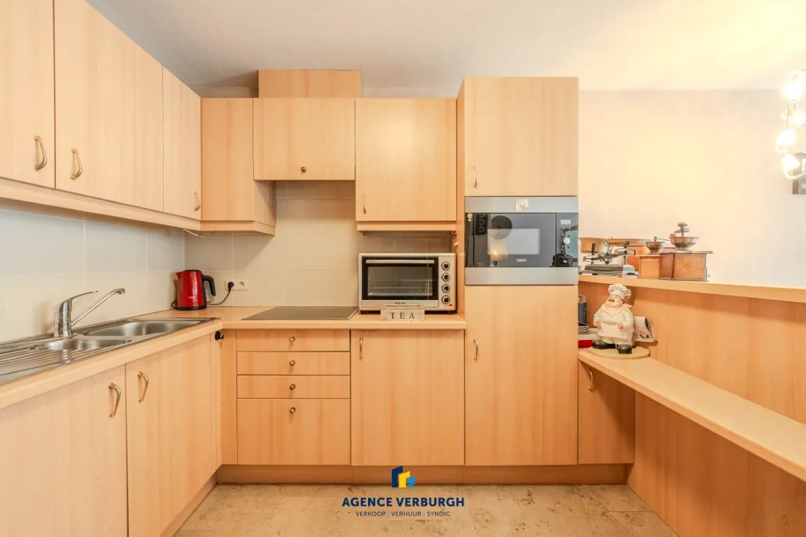 De ruime leefruimte is praktisch en doordacht ingedeeld en vormt een aangename plek om te ontspannen. De halfopen keuken sluit hier naadloos op aan, wat zorgt voor een open en gezellige woonbeleving. Dankzij de zuidgerichte oriëntatie geniet het appartement van natuurlijk licht doorheen de dag.
