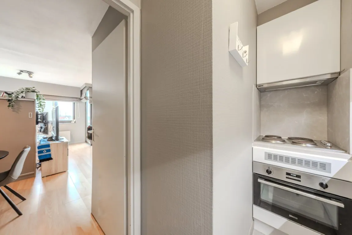 Welkom in deze vernieuwde en praktisch ingedeelde studio in het bruisende Blankenberge, ideaal als tweede verblijf of investering. Bij het binnenkomen worden we verwelkomd in een compacte inkomhal met vestiairekast, die voorziet in handige opbergruimte.
