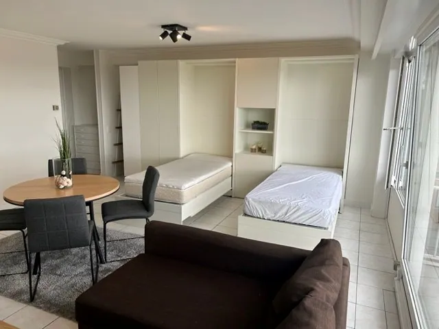 De studio wordt volledig bemeubeld verkocht, inclusief twee elektrische kastbedden – praktisch, stijlvol en ruimtebesparend.